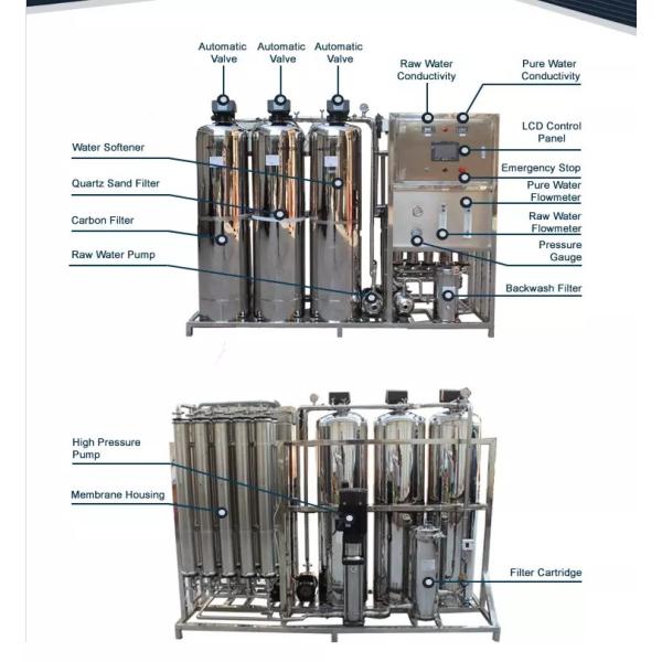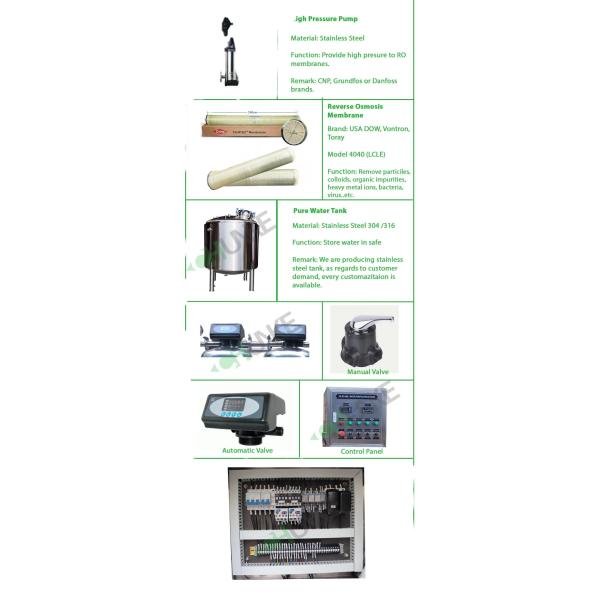 | Automatic CONTROL of PC program controller, Schneider electric, RO film automatic flushing, water level control of original and pure water tanks automatically stop and start up, functions of low pressure, high pressure, overheat, overcurrent, overload protection and alarm, manual operation is reserved. | ||||