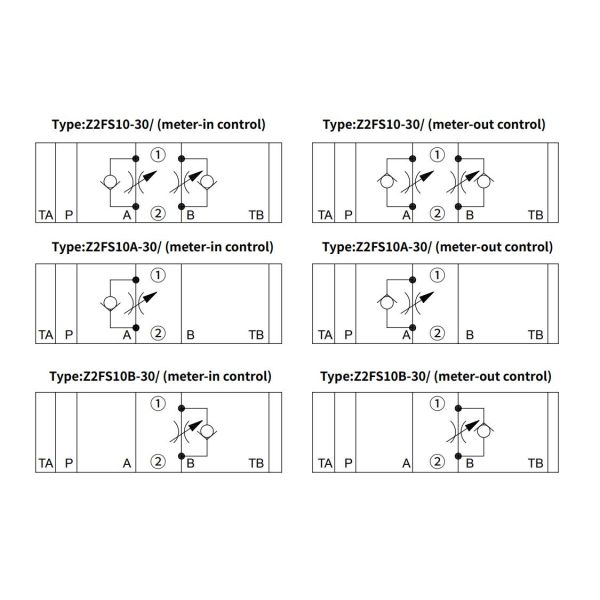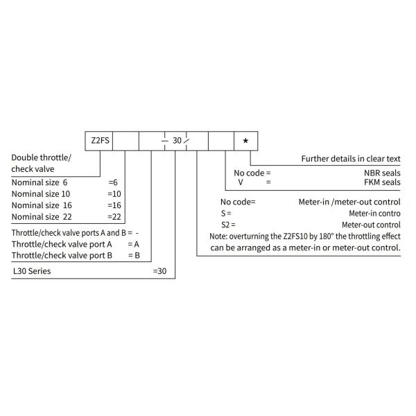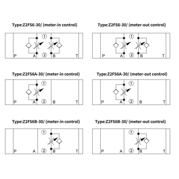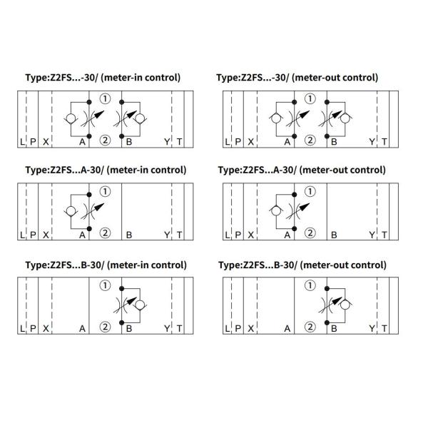Valve type Z2FS is a double throttle/check valve with sandwich plate structure. It is used to control the flow by changing the throttling. In the opposite direction, fluid flows freely through the check valve. For Z2FS10, depending on the installation position, the throttling effect may be arranged as a meter-in or a meter-out control. While for Z2FS16 and 22, depending on the model (S or S2) throttling may take place in either meter-in or meter-out, and at the same time the two operating oil chambers are connected.