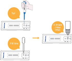 Use a disposal dropper: Hold the dropper vertically, draw the sample up to the Fill Line (Marked on the dropper, approximately 5μL), transfer the sample into the sample well "S", then add 4 drops(160μL) of sample buffer into the buffer well "D" and start the timer.