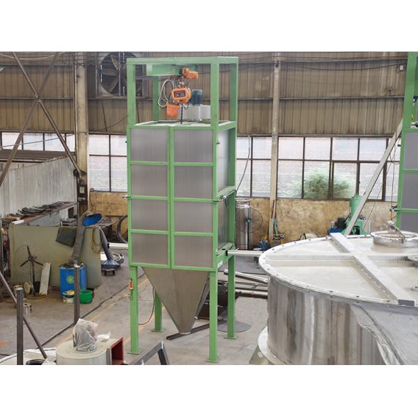 Ton Bag feeding station is composed of a frame with discharging hopper, electric hoist, diaphragm valve, pneumatic massage device, dust removal device, etc. Lift the tonnage bag from the ground to the equipment feed port through the crane/forklift, open the diaphragm valve manually, drop the tonnage bag port into the bin inlet, and then close the diaphragm valve, open the tonnage bag discharging port at the side quick-opening bag opening, and start discharging; The equipment is supplemented by pneumatic massage plate and vibration device to promote the material in the ton bag can be more complete discharge.