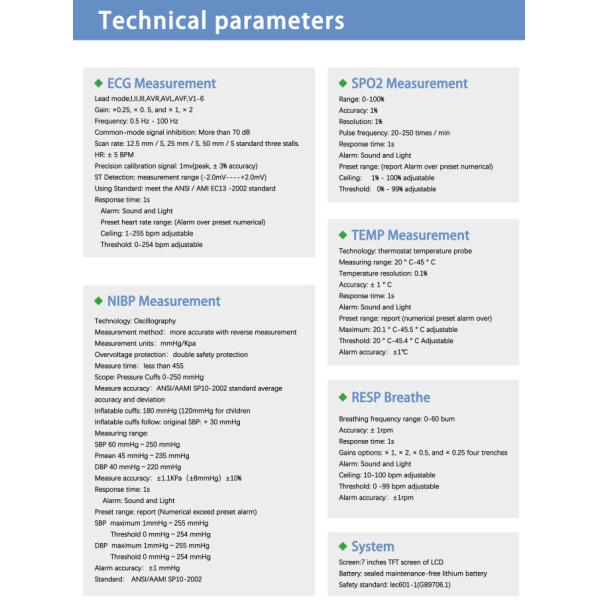 | Configurations: | SpO2, NIBP, TEMP, ECG,RESP, HR |