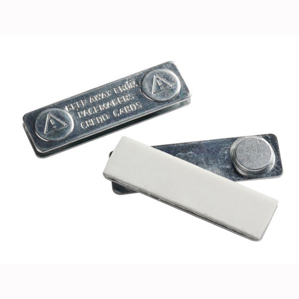 Our rare-earth magnetic badge fasteners are crafted from the highest quality neodymium in the world. This means that your neo magnet name badge stays firmly in place through almost any material, even outerwear. The permanent magnets naturally adhere to the steel badge plates through your shirt or jacket lapel. For aluminum badge plates, we include a complimentary adhesive steel piece that sticks to the back of your badge plate and attracts the magnetic badge fastener.