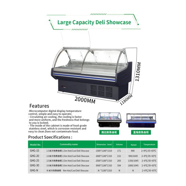 | GHG-20 | 2.0M Refrigerated/Hot Deli Showcase | 2000*1180*1310 | 2~8°C/35~65℃ | 232 | 900/1045 |