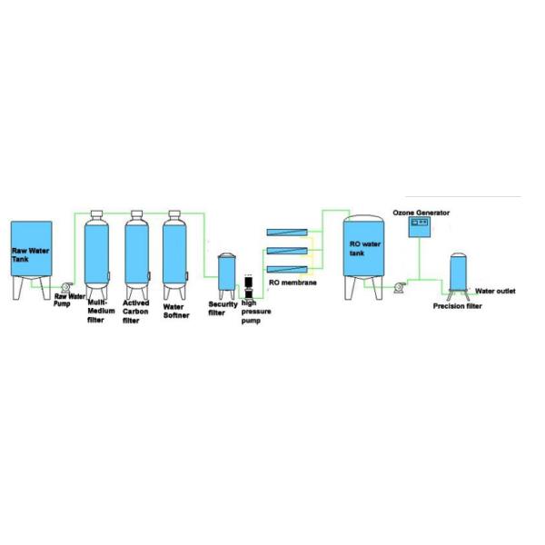 filter→Activated Carbon filter→Water softener / Inhibitor→ Precision filter→High pressure pump→1st RO filter→delivery pump→pure water tank→UV lamp