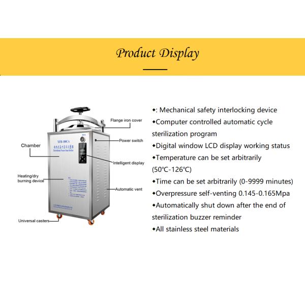 Three valve safety explosion-proof vertical autoclave sterilizer series products are rapid and reliable disinfection and sterilization equipment using pressure saturated steam. They are suitable for medical and health institutions, scientific research, agriculture and other units to sterilize medical equipment, dressings, glassware, solution cultures, etc. Bacteria is an ideal equipment.