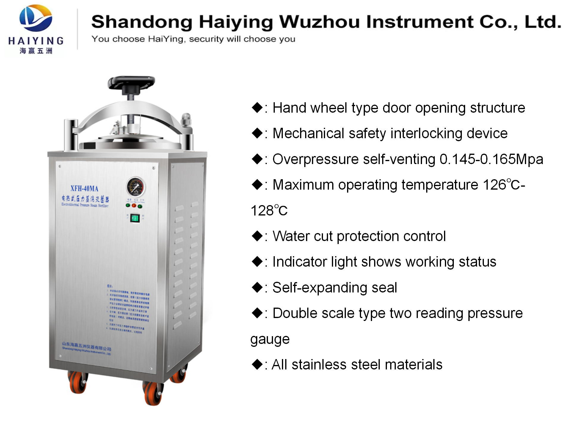 Vertical steam autoclave sterilizer is a rapid, reliable disinfection and sterilization equipment upon using of pressure-saturated steam. It is suitable for medical and health undertakings, scientific research, agriculture and other units.XFH series vertical steam autoclave sterilizer is users favorite model. It gas fully stainless high-alloy steel structure with a long using life.