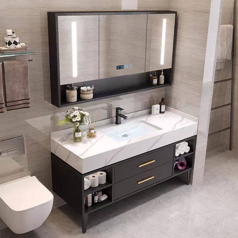 The bathroom cabinet is made with high-quality rock plate material, which is known for its durability, resistance to water, and easy maintenance. The sink is integrated into the cabinet, creating a seamless and elegant look that is perfect for any modern space. The solid wood or marble frame adds to the luxurious feel of the product, making it a perfect fit for hotels, villas, and malls.