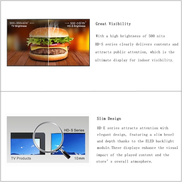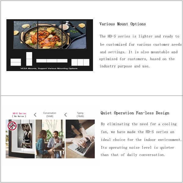 With a high brightness of 500 nits HD-S series clearly delivers contents and attracts public