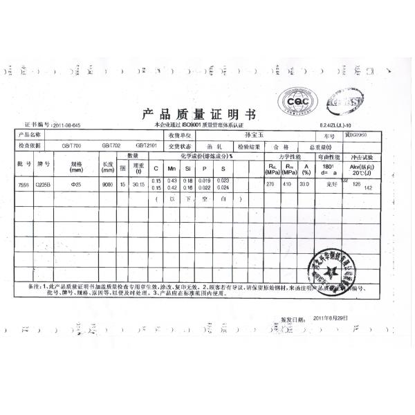 Tested Product:Certification of Raw Marterial