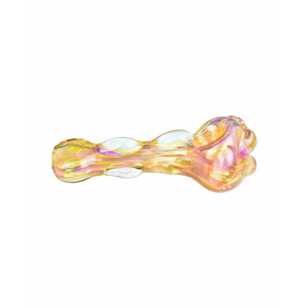 Every detail of the Bubble Bumps Fumed Spoon Pipe stands out. The multiple glass bumps give the spoon pipe a unique feel that can also be beneficial. The raised glass bubbles can be found along the neck and around the head of the hand pipe. Depending on the size of your hands and fingers, these protrusions will help you keep the pipe stable when handling it. A dropped pipe is a headache for everyone as it is a complete waste. You waste time cleaning up the mess. You waste money with all the dry herbs that is now on your floor. And worst of all you waste your time. Each glass bump on the Bubble Bumps Fumed Spoon Pipe helps prevent any of these problems. A deep bowl can hold plenty of dry herbs for hefty rips. The carb hole on the side controls the airflow. Place your finger on this hole to accelerate the rate at which your herbs will burn. The hand pipe is about four inches long and is two inches wide at the head. Both the bottom of the head and the mouthpiece are both flat. This keeps the pipe from tipping over when not in use. We here at DankStop are always looking out for your herbs and wallet. Even though the pipe leaves our warehouse, we continue to care about it. Every Bubble Bumps Fumed Spoon Pipe is made with fumed glass. Choose the overall hue that is expertly blended with the fumed glass. The golden amber takes a backseat to the other colors when in darker lighting. Fumed glass is a very interesting material as it changes the more you use it and the light in which it is displayed. Watch the colorful changes while you enjoy the Bubble BumpsFumed Spoon Pipe.