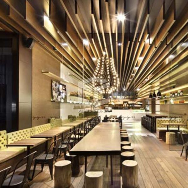 Here is the lastest design we have made recently for your reference. The wood displays are made of plywood with glossy finished laminated surface which is fire water as well as scratch proof. Equipped with LED lights will hightlight the bar and attract more customers' attention.