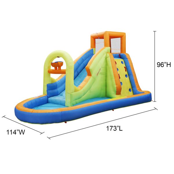| Features: | Bounce house, slide, climbing wall, basketball hoop |