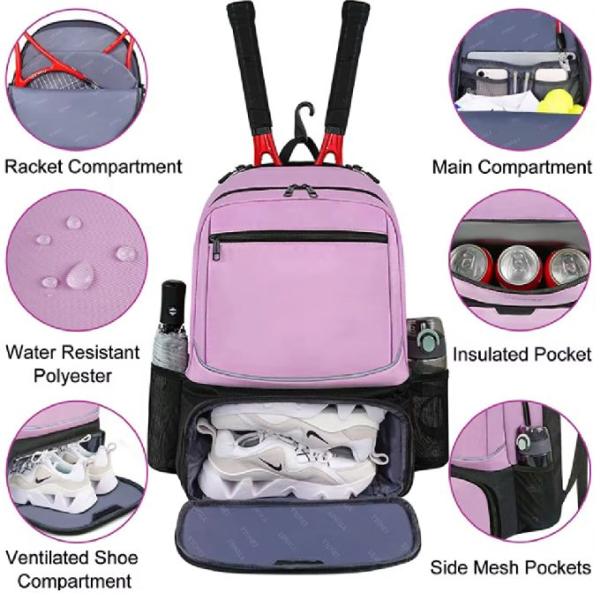 1. LARGE TENNIS BACKPACK: The padded tennis racket compartment can hold 2 tennis racquets. A separate shoe compartment with ventilation holes keeps this women's tennis backpack clean and enhances air circulation to disperse smell. A main compartment with small pockets and key fob hook can easily organize your tennis sports accessories. Two side mesh pockets are for water bottle, umbrella, or a can of balls.