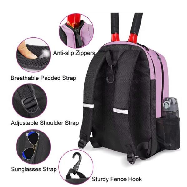 2. USER-FRIENDLY DESIGNS: The racquet compartment of this tennis racket bag is designed with a padded racket-shaped divider to separately hold and protect rackets well. And the double anti-slip zippers can help secure tennis rackets to stay in place. This tennis racquet bag has a practical fence hook to freely hang on the net and reflective belts on shoulder straps can fix your sunglass or hat.