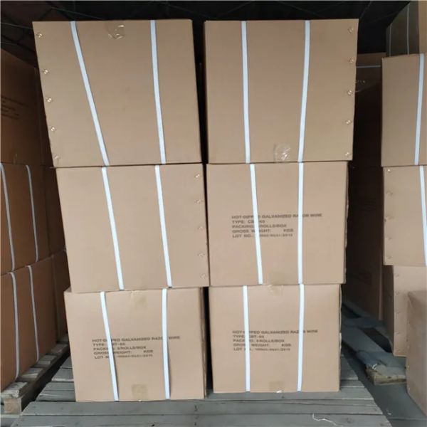 3) Corrugated Carton packaging, corrugated cartons can be customized according to customer requirements, and then 3-5 coils of razor wire are stacked into one carton, separated by cardboard in the middle.