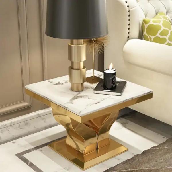Side Sofa Table, Marble edge table, Square shape table, Medium size table, Smooth surface table, No storage table, SEDIA brand, Modern style, Stainless steel material, Gold/Silver/Customized color.