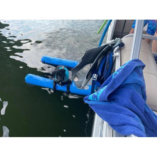 Constructed from robust DWF + 0.7mm PVC Tarpaulin materials, this dock promises durability and stability, ensuring your dog's water fun is both safe and lasting. The inflatable dock doubles as an inflatable dog water ramp , providing a reliable platform for dogs to play on or rest after a swim.