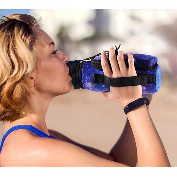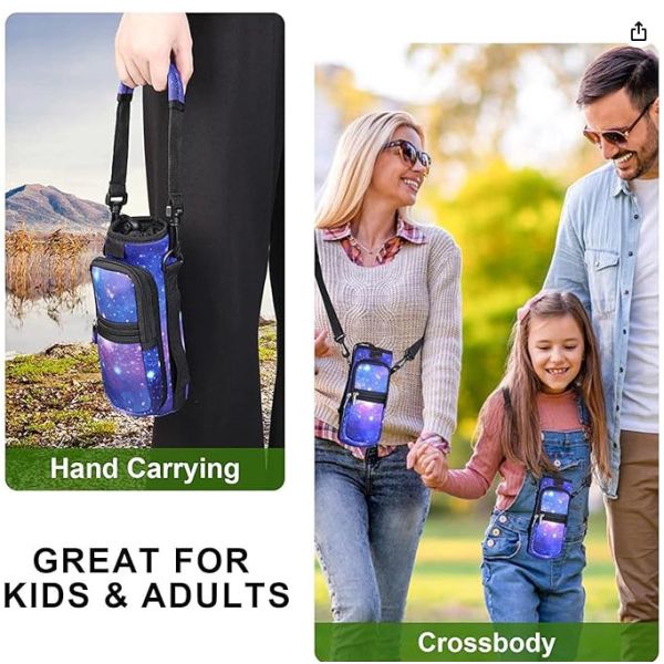 PREMIUM MATERIAL: Our water bottle holder for walking is made of soft neoprene material, which makes it more lightweight & sturdy and not easy to deform in long time use, has better water resistance, shockproof, it's great for stainless steel and plastic water bottles, sport and energy drinks, it will fully protect your bottle surface from being scratched, scraping, extrusion and so on. WIDELY USED: This water bottle carrier with strap is the perfect for hiking, cycling, camping, travel, school, commute, jogging, or even if you're at the beach, at the gym, or at sports events. 2 POCKETS: The small zipper pocket of the water bottle bag is for cash and card, the large zipper pocket is for keys, smartphone, and other essentials. When you go out, you just need to bring this water bottle bag, no need to carry the bag to hold these small items. TWO WAYS TO CARRY: Equipped with padded handle strap and adjustable shoulder strap, you can carry the water bottle sling on your shoulder or cross-body as a messenger bag or carry it in your hand, it's comfortable for you to carry. This sports water bottle carrier bag making your hands free from holding the bottle when outdoors. GREAT FOR KIDS & ADULTS: With an adjustable shoulder strap, which is suitable for all body types. Both adults and Kids can find great use in this water bottle carrier.