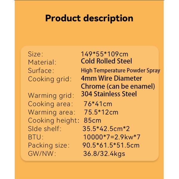 | Packaging Details: | Size: 149*55*109 cm Material: Steel Surface: high temp powder coated Cooking grid: Dia. 4mm chromed Warming grid: 304 SS Cooking area: 76*41cm Warming area: 75.5*12cm Cooking height: 85cm Side shelf:35.5*42.5cm*2 |
