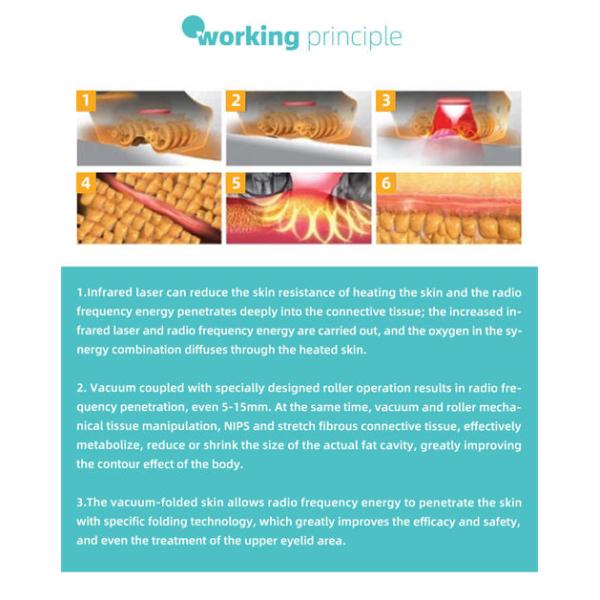 Infrared RF Vacuum Roller technology combines infrared light, bi-polar radio frequency energy and vacuum, which cause deep heating of the fat cells, their surrounding connective tissue and the underlying dermal collagen fibers. This type of efficient heating and vacuum stimulates the growth of new and better collagen and elastin which results in localized reduction in skin laxity, body volume, and an overall improvement in skin structure and texture.