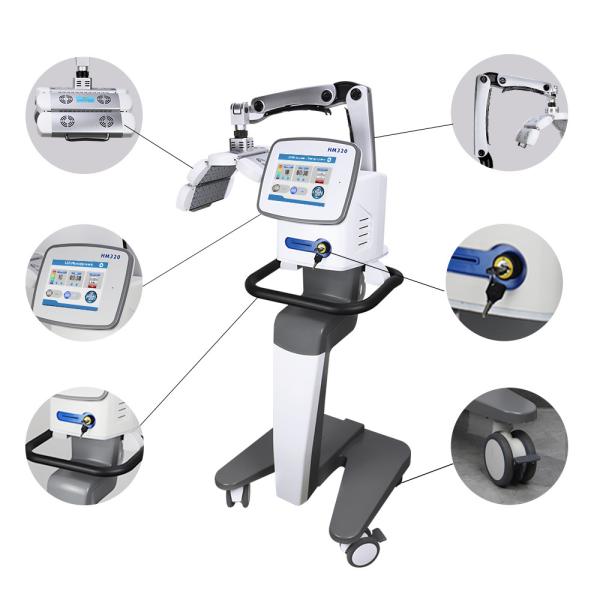 The machine's primary function is to stimulate hair regrowth and reduce further hair loss using LED light therapy. This treatment uses specific wavelengths of light to penetrate the scalp and stimulate hair follicles, promoting new hair growth and preventing further hair loss. The HM230 model has a power density of ≤300mW/cm2, making it a powerful device for hair regrowth treatment.