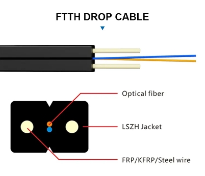 Fibra Optica Indoor Optic Fibre Cable G657A1 G652D 1 Core GJXH GJXFH Fiber FTTH Drop Cable In the FTTH application, it has low cost and good adaptability, meeting the design and connection requirements for all kinds of drop cables. It has excellent anti-bending ability, supports dense cabling, has low bending loss at a small bend radius, and high mechanical reliability, and is easy to install and distribute. It is suitable for indoor FTTH applications. The dimension is 2X3.0mm in a bow-type, with FRP or STEEL strength member in each size, an LSZH sheath, and 1/2 cores of G.657A optical fibers.![]()