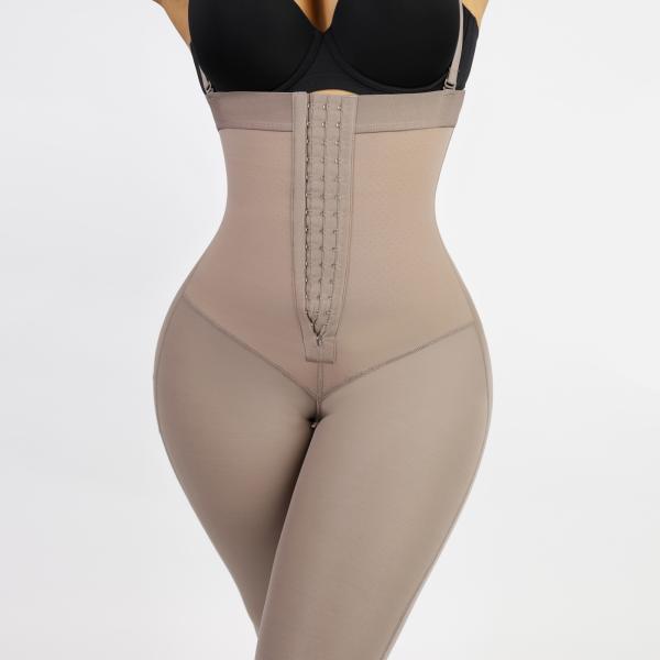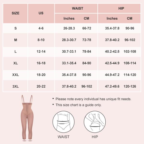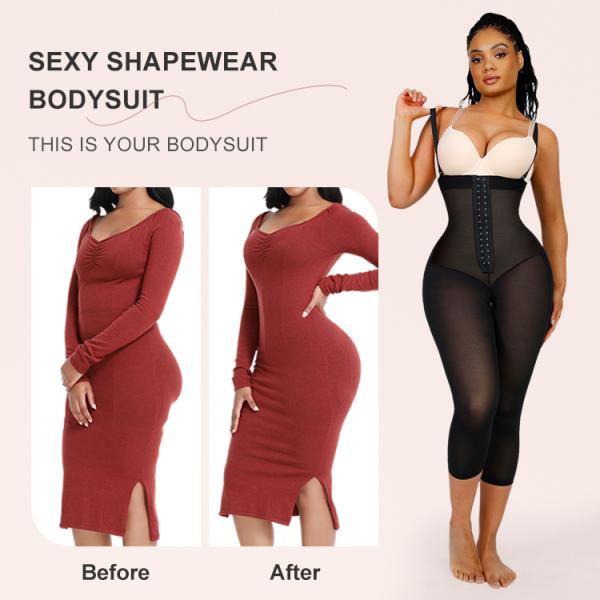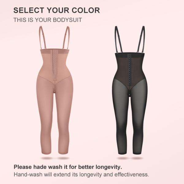 comfortable and breathable, with triple layer compressive fabric. 2. Ultra-strong compressive mesh fabric, with comfortable lining fabric, enhances skin-friendliness and comfort. 3. Zip closure crotch, which is more concealed and makes it convenient for your lavatory visit. 4. The buttocks lifting design effectively lifts your butt. 5. The buttocks are sexy and seen-through that is comfortable and squeeze-free. 6. The length of the pants reaches the calf, enhancing your leg curves. 7. Three rows of adjustable hook and eye closure. 8. Comes with detachable and adjustable straps. Material: Exterior/Outside: 66%Nylon 34%Spandex; Middle Lining: 100% Latex; Interior/Linning: 75%Nylon 25%Spandex; | ||||||