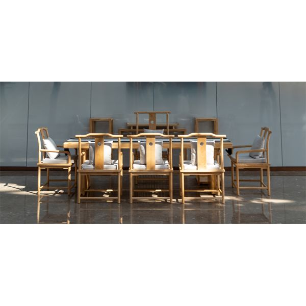This hotel lobby furniture set, in order to promote oriental aesthetics, interpretation of natural elegance as the design concept, the elements of solid wood and modern design language cleverly combined, aimed at creating a peaceful and elegant hospitality environment for the hotel lobby. The set includes solid wood tea table, tea chair, coffee table and other core furniture, the overall style of harmony and unity, natural tone, presenting a strong wood flavour and modern simplicity.