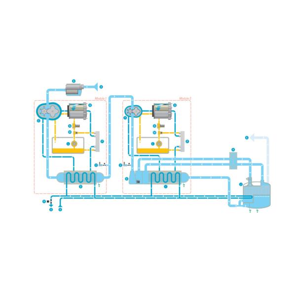 brought into the cycle and splits towards the both modules and the