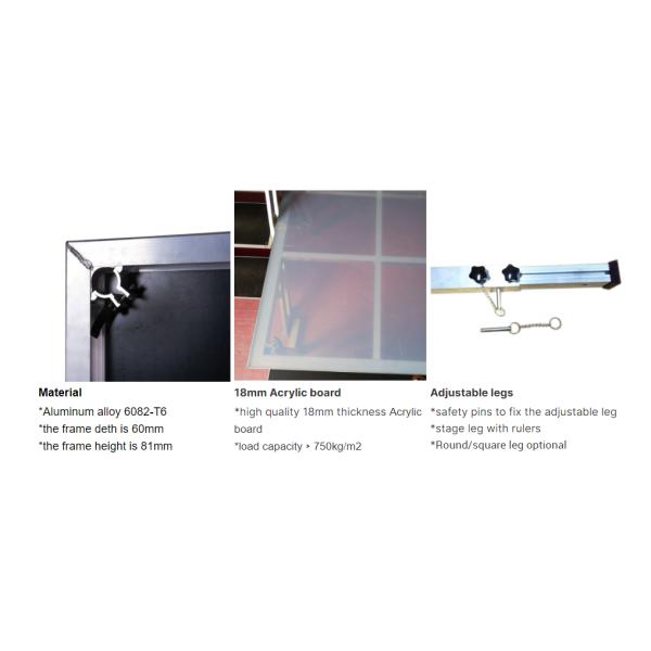 Glass or Acrylic Panels: The stage surface is comprised of glass or acrylic panels. These panels provide a transparent or translucent surface that adds a modern and elegant aesthetic to the stage. Glass panels are durable and offer excellent clarity, while acrylic panels are lightweight and shatter-resistant.