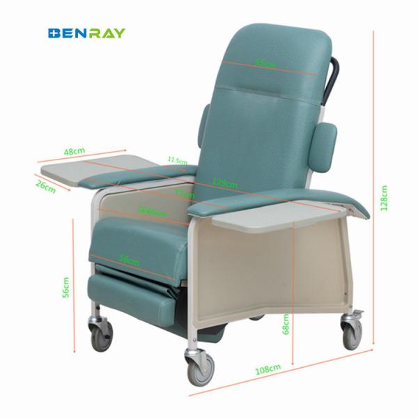 Three postion recliner includes user friendly features,such as convenient overlap tray and foot-rest which fold completely under chair.Allowing users to rise to a standing position more easily,Easy to maeuver,it features four casters,two of which can be lock for security