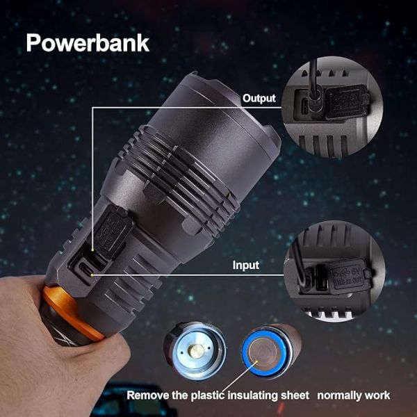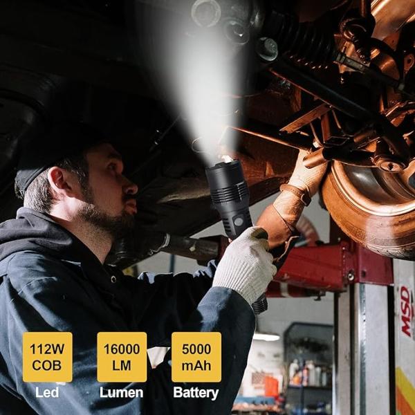 • 【 Super Bright Flashlight】LED flashlight uses the latest LED Cob light beads with the high output of up to16000 Lumen. It generates a brilliant large area floodlight. Equipped with a large-capacity 7.4V/5000mAh rechargeable battery, it has a long battery life and can be recycled for a long time,saving money. The rechargeable flashlight has a built-in USB charging cable for input and output.