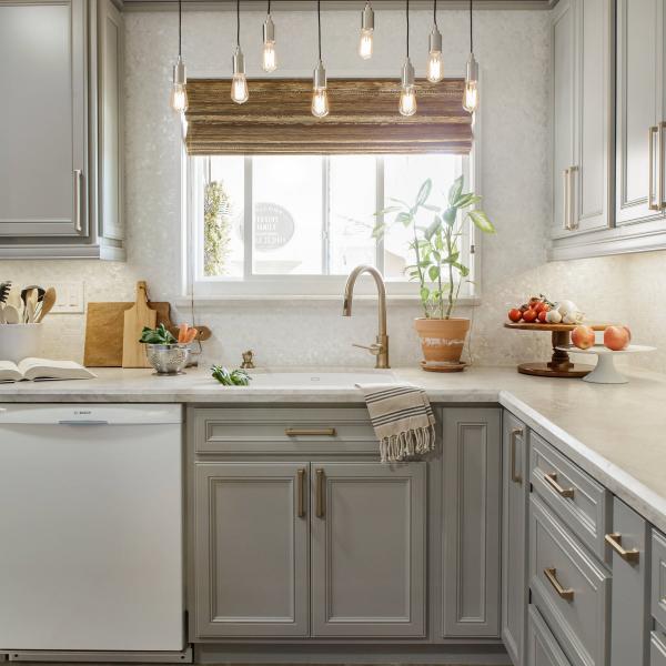 | Cabinet type: | Farmhouse Style Grey base unit & wall unit with black wood grain island |
