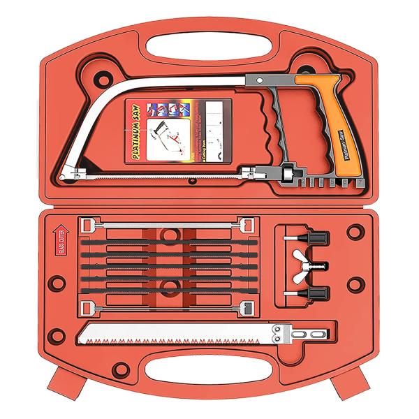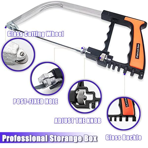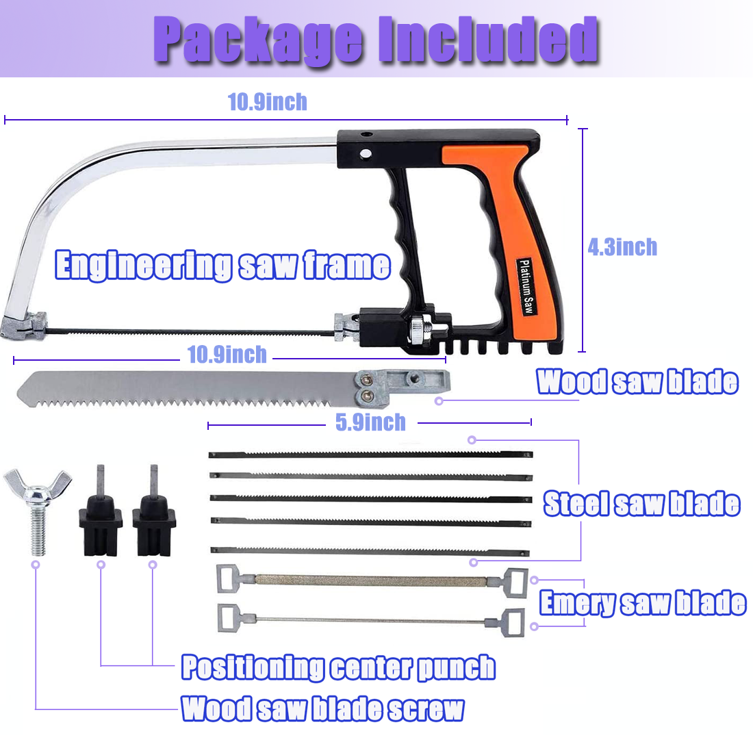 Package Included:4.3*10.9inch engineering saw frame, wood saw blade, steel saw blades, emery saw blades, wood saw blade screw, positoning center punch and professional storage box