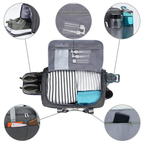 • GOTTA LOVE BONUSES: 1.) Side shoe pocket has two exclusive ventilated air vents and can also be used as a dirty laundry compartment, water & odor resistant. 2.) The sleeve on the back of the duffle has an additional adhesion belt to keep the bag stayed on the suitcase tightly. 3.) It comes with rounded stitched grip handles and padded, adjustable, removable shoulder strap buckle