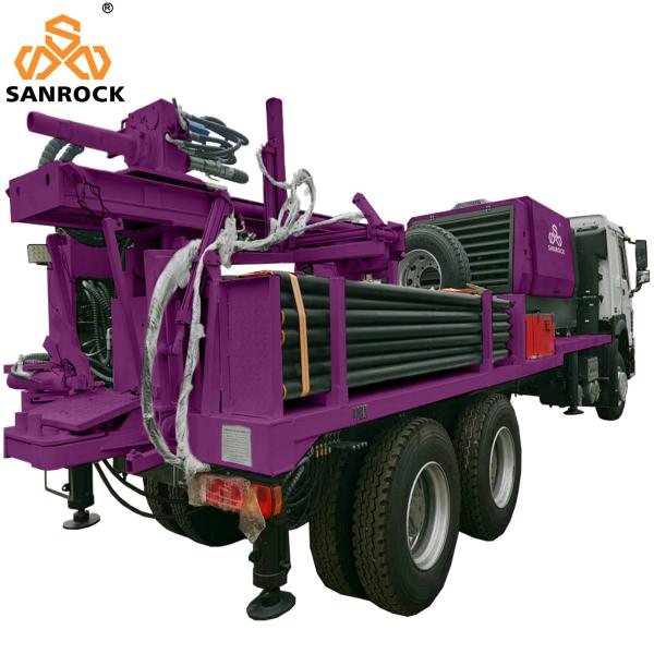 SANROCK truck mounted versatile well drilling rig is a new, efficient and multifunctional hydraulic rig, mainly applicable to all kinds of drilling process of wells, monitor boreholes, geothermal boreholes, and grouting holes of cofferdam, dam and reinforced base, as well as drilling of open pit mining, anchor reinforcement project and defense project. The rig equips with powerful hydraulic motor, heavy hydraulic drilling arm and high pressure DTH percussive hammer, and its drilling speed is faster than other type of rigs.