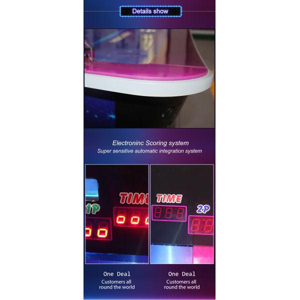 After insert coins, start to play after 3 seconds. The hockey will drops from one hole. Players can shoot the hockey in the opposite's side hockey hole. Then score. The left side of the hockey table can show the current score and time. When finish the count down, game time end.