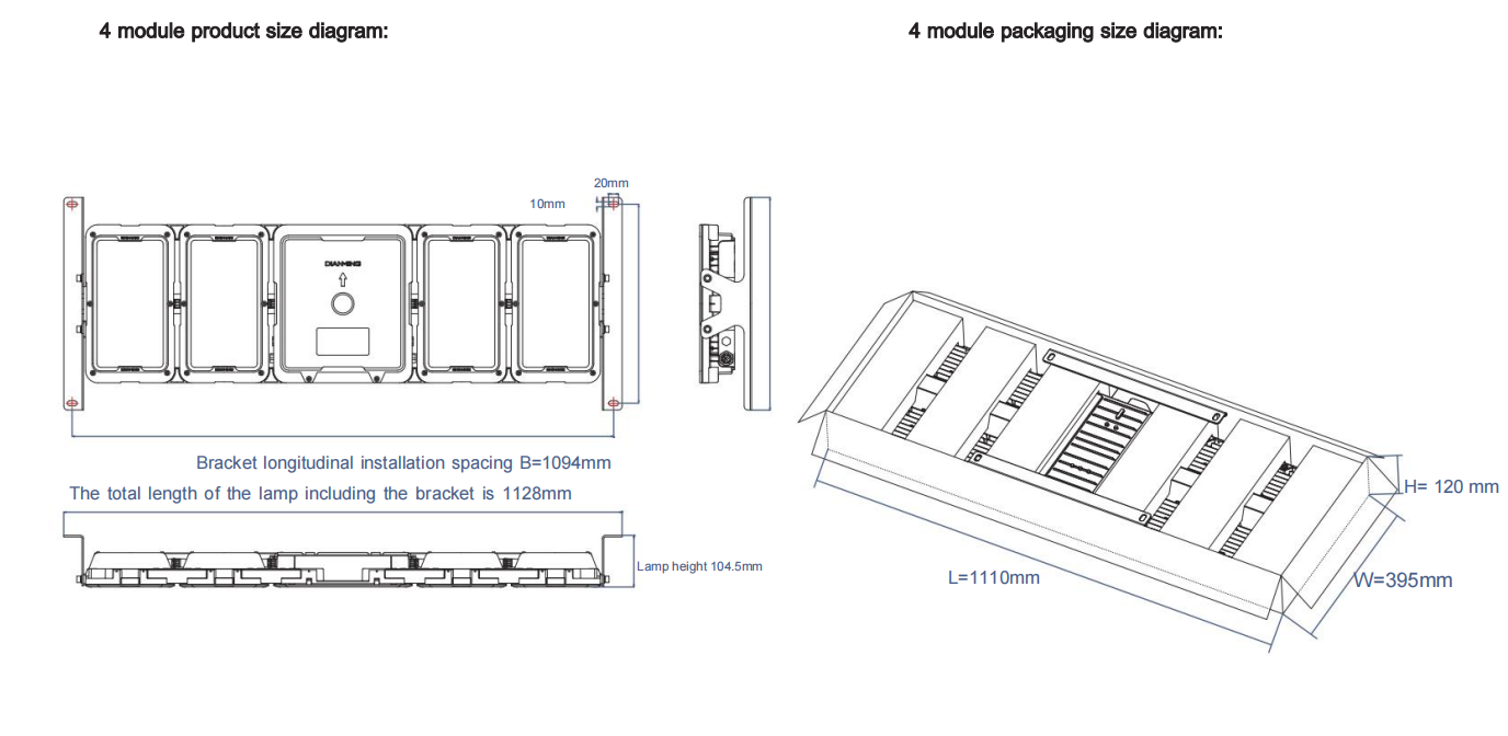 | MFTL-T9-350 | 350W | 4 pcs | 1128*430*104.5 | 402.5mm | 1904mm | 0.4850m² | 16.28kg | 1110*395*120(mm) |