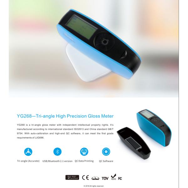 YG268 gloss meter features with 20° 60° 85° angle, manufactured according to ISO2813 and GB/T 9754. It is also compatible with international standards of ASTM D523, ASTM D2457. YG268 conforms to JJG696 first class gloss meter working requirement, corresponding with CIE 1931(2°) under CIE C light source.