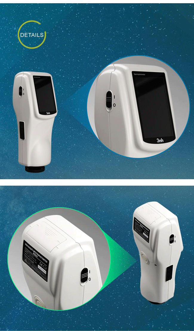 NS820 spectrophotometer dispaly complete relectance rate and input LABvalue manually; D/8 structure(diffuse illuminatio,8-degree viewing); 3.5 inch large capacitive touch screen, fully functional touch control; The repeatability delta E*ab is within 0.04, errors is less than 0.2; Large capacity storage, more than 15000 data; PC software with powerful extension function;. 15 degree oblique angle screen, in line with the human eye observation; Oversized integarting sphere, more effective homogenization ray of lights; High hardware configuration with a number of innovative technology.