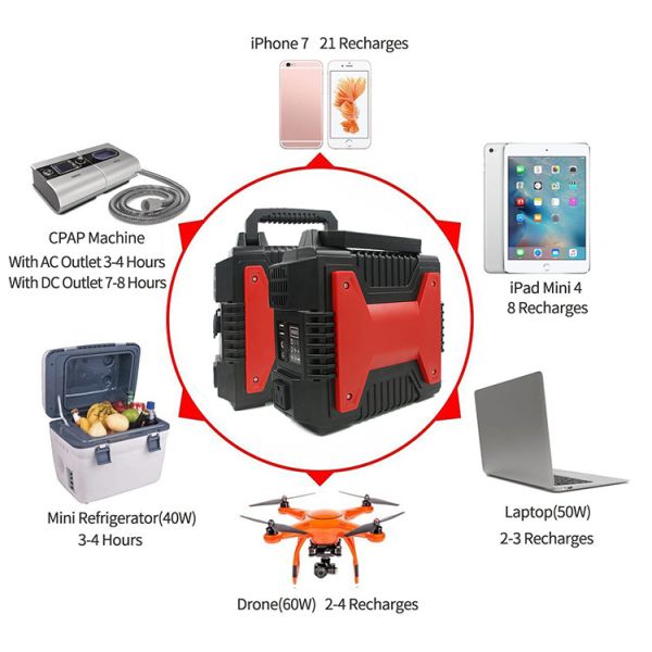 | Output: | DC output :4*USB 5V -2.1A, 2*5.5mmDC output :9-12.6V/15A max 11.AC output :pure sinewave output :AC continuous output :500W, AC voltage :110V AC±5% output frequency :50/60Hz±5% |
