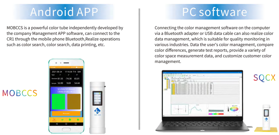 The built-in "smart button" of the instrument can independently complete the measurement function setting or test data review. It does not need to connect a mobile phone and a computer. A single machine can realize all the functions of the color difference meter; and at the same time, it can be connected to the mobile phone APP or computer software, taking into account the various functions of the color difference measurement and color management.