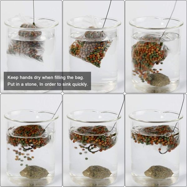 PVA fishing bag is used for containing fishing baits,it is an easy, efficient way to get your bait to range without the mass, it will be dissolved in water and the baits allures more fish to eat.