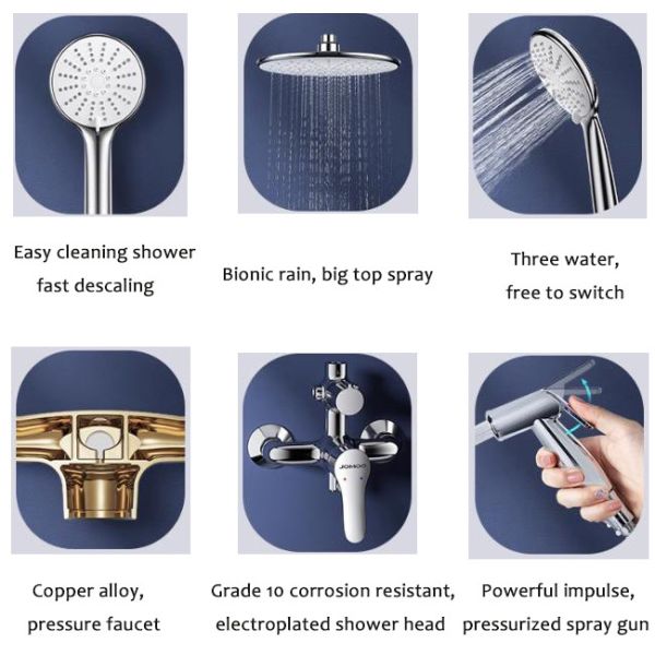 | Function | Rainfall mode, Rain curtain mode, Waterfall mode, Spa mist mode, Hand shower+Spout faucet mode, Body jet mode, Other mixed modes for your customization |