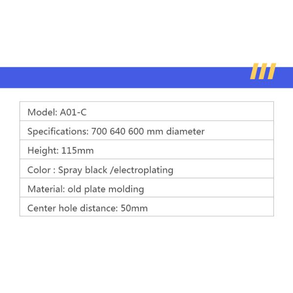 | Detail description | Specification: 700 640 600 mm diameter Center hole distance: 50mm Height: 115mm Material: Cold plate molding 35 round tube 1.1 thick Color: Spray black /electroplating |