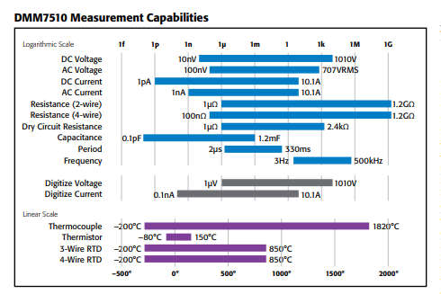 The Model DMM7510’s design makes the most of Keithley’s low level measurement expertise. Features like the low noise input stage and the 32-bit A-to-D converter allow this instrument to deliver DC accuracies typically only found in metrology-grade instrumentation—but at about half the price of those solutions. The Model DMM7510’s 100mV, 10Ω, and 10µA ranges deliver the sensitivity needed to measure low signals with confidence when characterizing today’s demanding electronic designs. In addition to one- and two-year accuracy specifications, an auto-calibration function ensures greater accuracy between calibration cycles.
