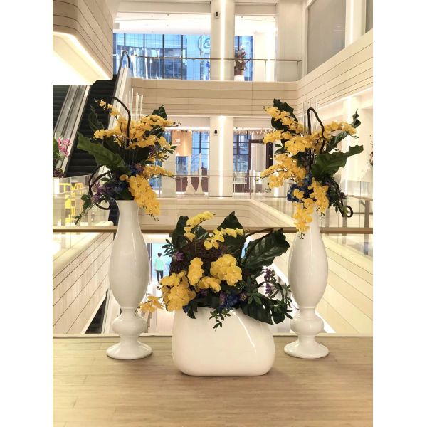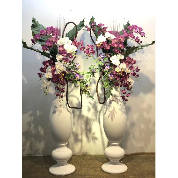 We have created this classical oriental flavour mall floral standing vase for you. With the theme of flowers and moonlight, we used a classical vase shape and a Chinese flower arrangement with two different coloured phalaenopsis orchids.