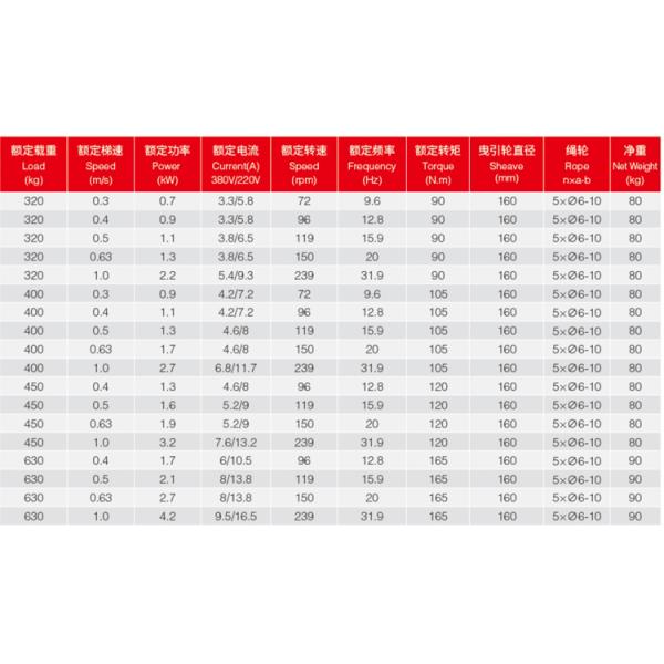 Gearless Traction Machine Specification (Roping 2:1; Sheave 160mm)