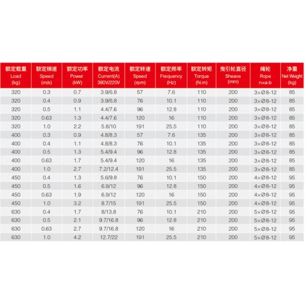 Gearless Traction Machine Specification (Roping 2:1; Sheave 200mm)