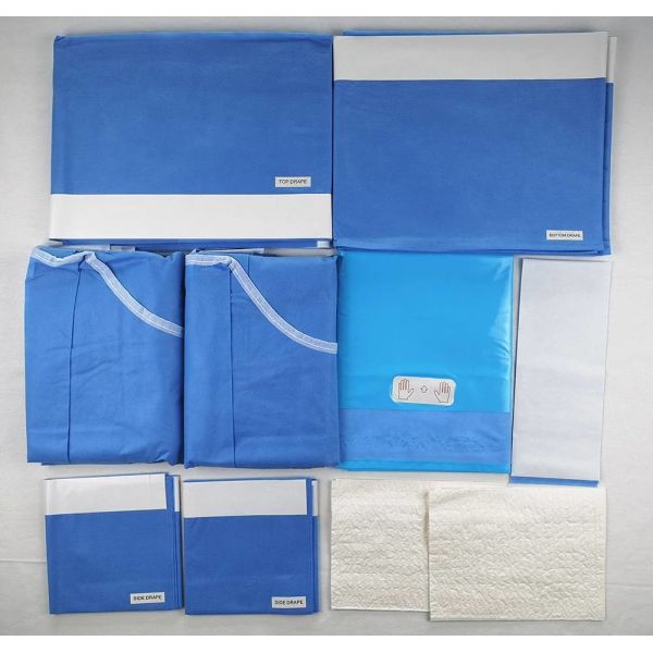 | Details | 1pc Table cover 140x190 cm 1pc OP tape 10x50cm 2pcs Hand towel 30x40cm 1pc Mayo Stand Cover 58x137 cm 2pcs Surgical gown XXL 155x170cm 2pcs Side drape 60x60cm 1pc Top drape 150x240cm 1pc Bottom drape 150x1 80cm |